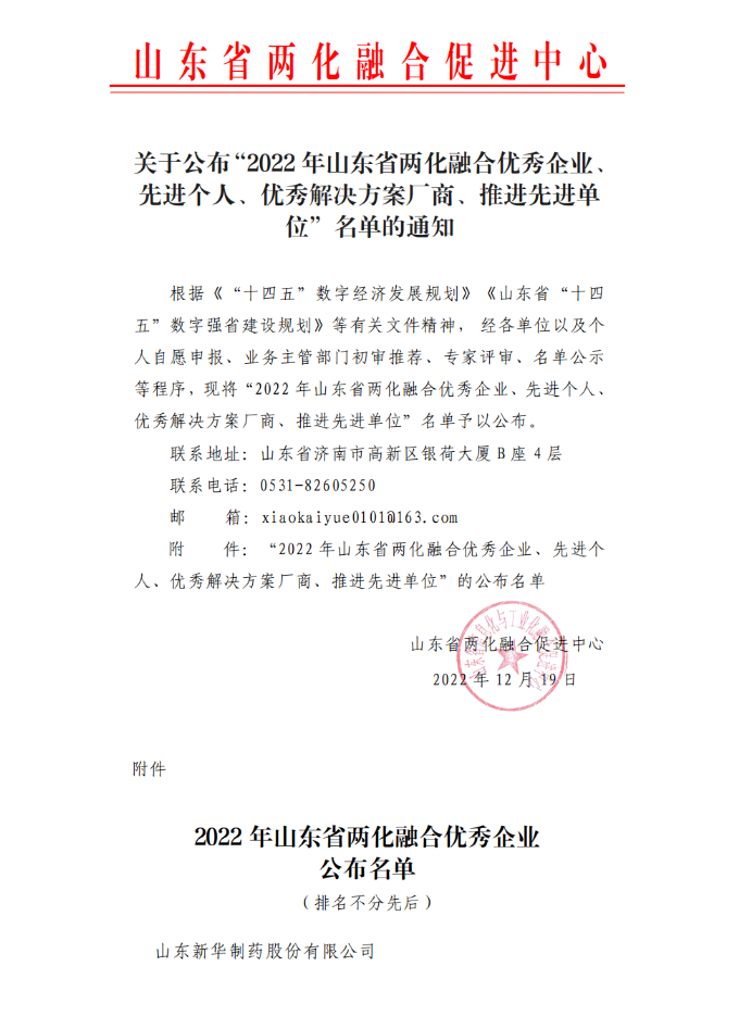 近日,山東省兩化融合促進(jìn)中心發(fā)布“2022年山東省兩化融合優(yōu)秀企業(yè)、先進(jìn)個(gè)人、優(yōu)秀解決方案廠商、推進(jìn)先進(jìn)單位”名單,新華制藥連續(xù)第二年上榜,再度榮獲“兩化融合優(yōu)秀企業(yè)”榮譽(yù)稱號(hào)。