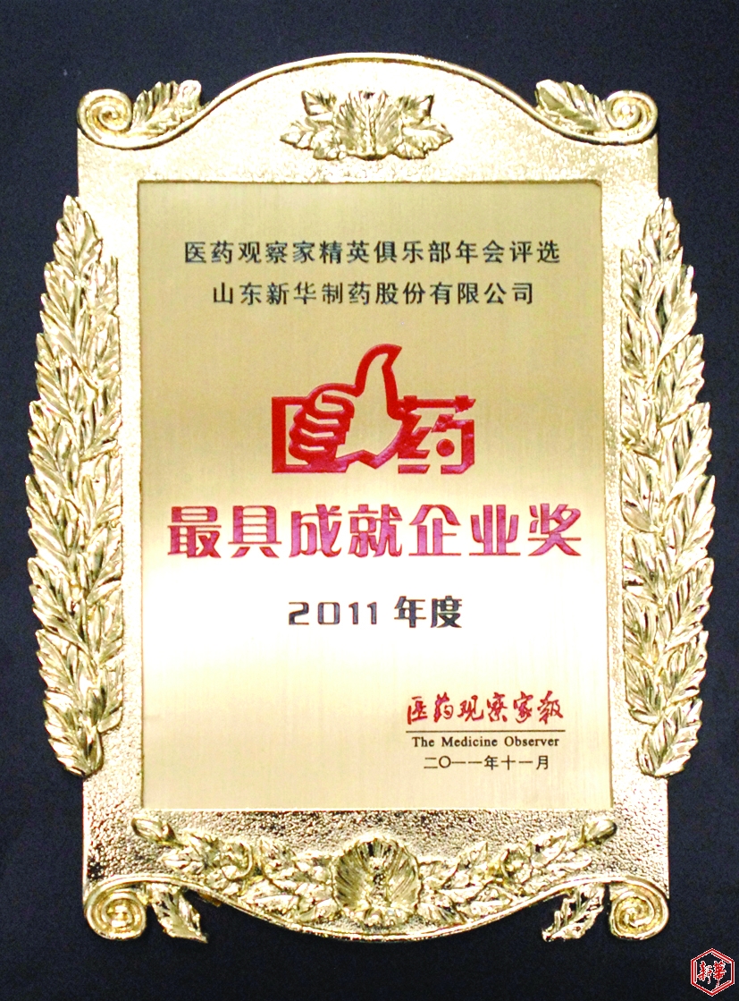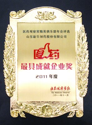 本屆論壇的一個重要環節是,發布了2011年度“新銳力榜”榜單。醫藥觀察家論壇是一個非官方、非營利的醫藥行業論壇品牌,是一個行業領導者、研究學者、業界精英溝通交流的平臺,也是一個企業與市場有效對接的舞臺。該榜單完全由第三方機構參與評選,從企業的影響力、年度貢獻、關注度、公眾印象等多個方面進行綜合評定,公信力強,影響力大,具有廣泛代表性。本屆榜單設置了“十大醫藥精英”、“最具成就企業獎”等獎項,并在現場舉行了隆重的頒獎儀式。新華制藥摘得“2011年度最具成就企業獎”。