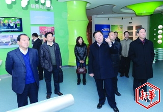 12月25日,淄博市人大常委會第一副主任王頂岐和部分省市人大代表視察新華制藥。圖為公司董事長、黨委書記張代銘陪同代表們參觀新華制藥展覽館。 (于海民)