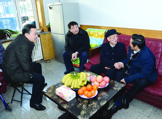 1月20日,山東省國資委副巡視員李現實在華魯集團黨委副書記紀委書記韓惠忠的陪同下來公司慰問離退休老干部。圖為李現實一行親切看望離休干部鐘平。 (于海民)