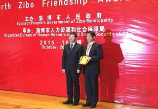 2015年10月,黃利男榮獲“淄博市友誼獎(jiǎng)”。“淄博友誼獎(jiǎng)”是淄博市政府為表彰在淄博經(jīng)濟(jì)建設(shè)和社會(huì)發(fā)展中做出突出貢獻(xiàn)的外國(guó)專家而設(shè)立的最高榮譽(yù)獎(jiǎng),一般兩年進(jìn)行一次評(píng)選表彰,每次評(píng)選表彰10名左右外國(guó)專家。圖為淄博市長(zhǎng)周連華為黃利男進(jìn)行頒獎(jiǎng)。