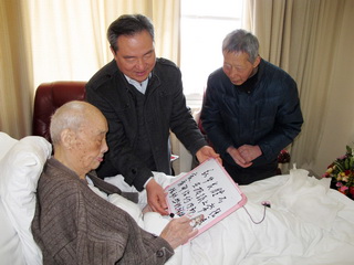 張老今年100歲高齡,因病在齊魯醫院治療修養。看到新華制藥派人探望他,非常開心,“你們來,我非常高興。”還舉著大拇指說,“新華有戰斗精神!”張老在寫字板上表達了對新華制藥和新華人的深情,他寫到“新華長盛不衰。在報紙上常看到你們內部活動,熱情洋溢。”張老的小兒子介紹,張老對于公司郵寄給他的《新華藥業》每期必看,生活非常規律,對家人要求嚴格,還積極參加干休所的書法大賽。