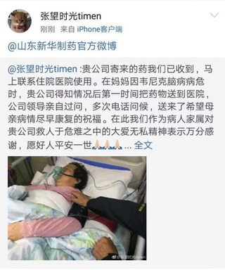 2018年12月28日,新華制藥政工部得知,新華制藥官方微博上有一位名為張望時光timen的貴州患者家屬發(fā)出求援微博。他媽媽因直腸癌化療出現(xiàn)了WE(韋尼克)腦病,病情十分危重,急需甲硫氨酸維B1注射液治療。韋尼克腦病的病因是硫胺缺乏,硫胺缺乏的原因主要是直腸癌及化療導(dǎo)致的硫胺缺乏并發(fā)癥。患者家屬在貴州各大醫(yī)院無法買到這種藥物,為了救媽媽的命,張望時光timen通過微博發(fā)出了求助信息。