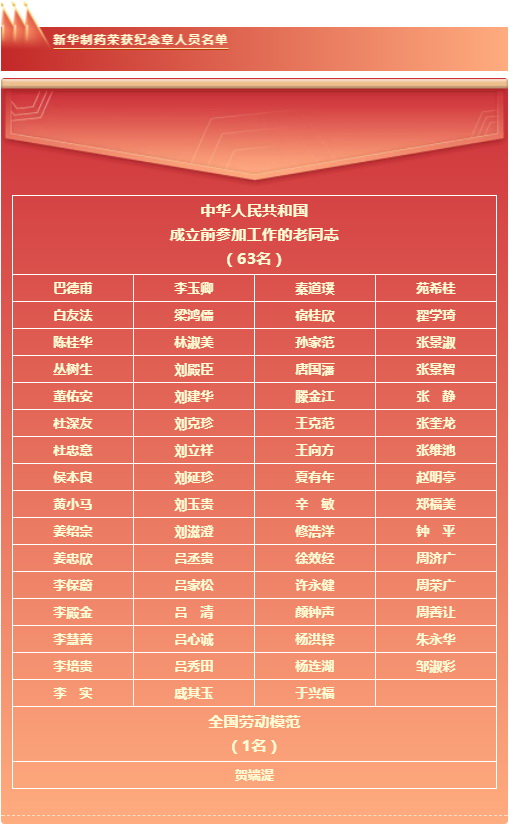 在中華人民共和國(guó)成立70周年之際,中共中央、國(guó)務(wù)院、中央軍委向在中華人民共和國(guó)成立前參加工作的老同志以及中華人民共和國(guó)成立后獲得國(guó)家勞動(dòng)模范表彰獎(jiǎng)勵(lì)的人員,頒發(fā)“慶祝中華人民共和國(guó)成立70周年”紀(jì)念章。新華制藥有64人獲此殊榮!