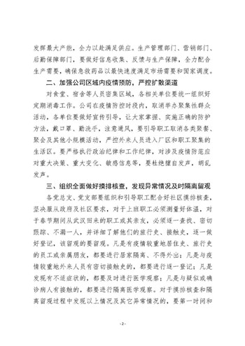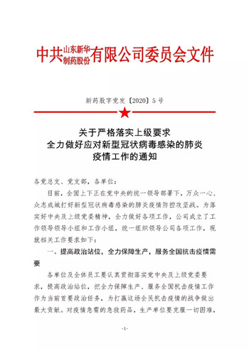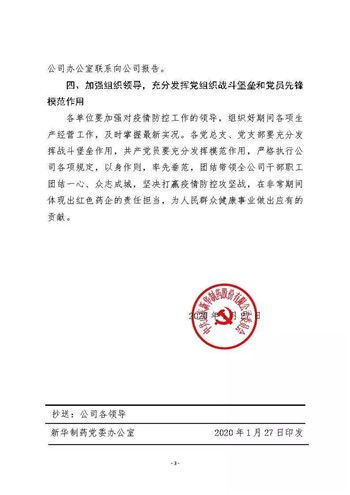 新型冠狀病毒感染的肺炎疫情發(fā)生以來,公司黨委第一時(shí)間成立疫情防控領(lǐng)導(dǎo)小組和工作小組,公司黨委書記、董事長張代銘任領(lǐng)導(dǎo)小組組長,多次召開專題會(huì)議,先后印發(fā)《關(guān)于嚴(yán)格落實(shí)上級(jí)要求全力做好應(yīng)對(duì)新型冠狀病毒感染的肺炎疫情工作的通知》等多個(gè)文件,要求各單位提高政治站位、全力保障藥品生產(chǎn),加強(qiáng)公司區(qū)域疫情預(yù)防、嚴(yán)控?cái)U(kuò)散渠道,全面做好摸排核查、發(fā)現(xiàn)異常情況及時(shí)隔離留觀,加強(qiáng)組織領(lǐng)導(dǎo)、充分發(fā)揮黨組織戰(zhàn)斗堡壘和黨員先鋒模范作用。