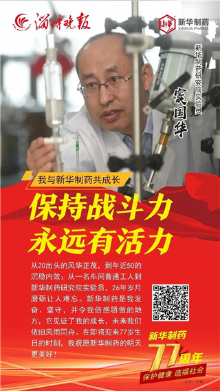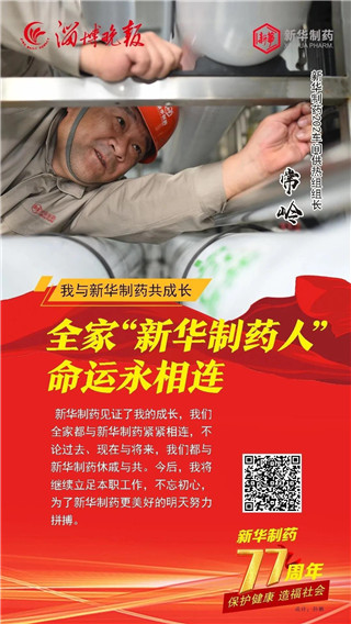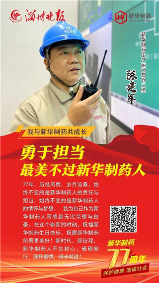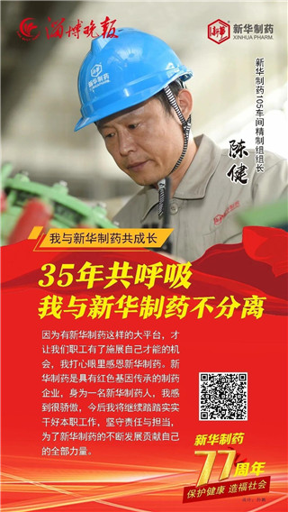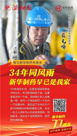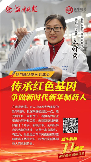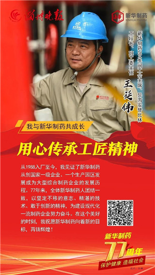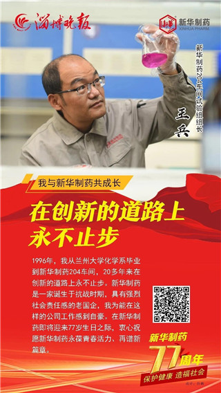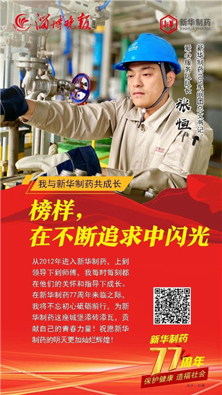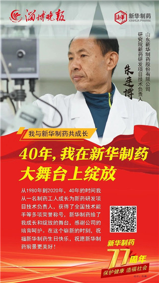 合力奮斗成就發展偉業, 道德榜樣鑄就企業之魂。 2020年11月1日, 是山東新華制藥股份有限公司77歲生日。 縱覽77年發展的歷史長河, 她的每次乘風破浪都離不開榜樣引領。 在創建77周年之際, 新華制藥與淄博晚報共同策劃推出 “我與新華制藥共成長” 專題報道, 精選出了10位代表人物, 他們是: 朱連博、王付榮、竇國華、崔克峰、王延偉、 王兵、常嶺、陳健、陳建軍、張恒, 他們中有道德模范、有勞動模范、有博士、 有技術能手、還有特殊人才, 在他們身上我們能讀懂 一家紅色藥企不平凡的發展之路。