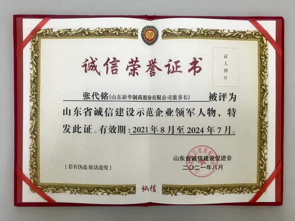 近日,新華制藥被評為“山東省誠信建設示范企業”,董事長、黨委書記張代銘被評為“山東省誠信建設示范企業領軍人物”。