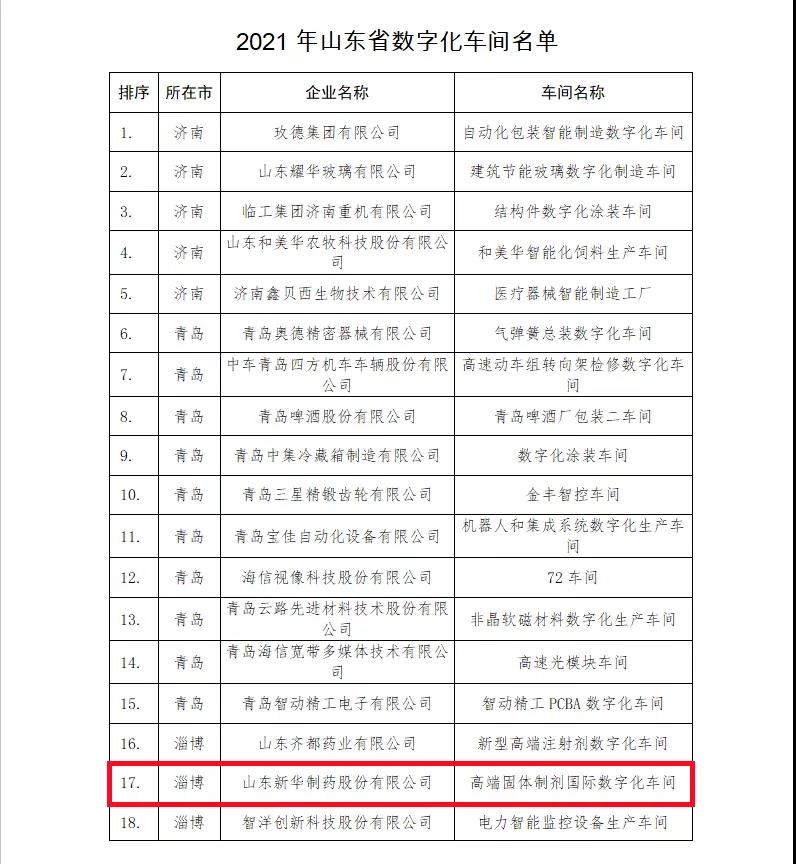 為深入貫徹落實省委、省政府加快建設制造強省的部署要求,根據《2021年全省智能制造工作要點》《關于開展2021年省級智能工廠和數字化車間申報工作的通知》,經企業申報、地市推薦、專家評審和公示,省工信廳11月24日公布新華制藥“高端固體制劑國際數字化車間”為2021年山東省數字化車間。