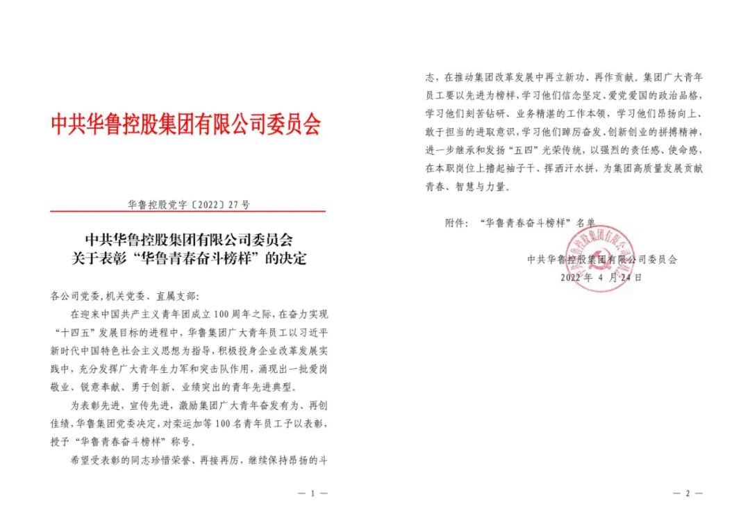 2022年是喜迎黨的二十大勝利召開之年,也是中國(guó)共產(chǎn)主義青年團(tuán)成立100周年。為進(jìn)一步激勵(lì)廣大青年員工奮發(fā)有為、再創(chuàng)佳績(jī),為企業(yè)高質(zhì)量發(fā)展貢獻(xiàn)青春、智慧與力量,五四前夕,華魯集團(tuán)從青年員工中評(píng)選出愛崗敬業(yè)、銳意奉獻(xiàn)、勇于創(chuàng)新、業(yè)績(jī)突出青年先進(jìn)典型,表彰為“華魯青春奮斗榜樣”,其中,新華制藥劉健等26名青年員工光榮入選。