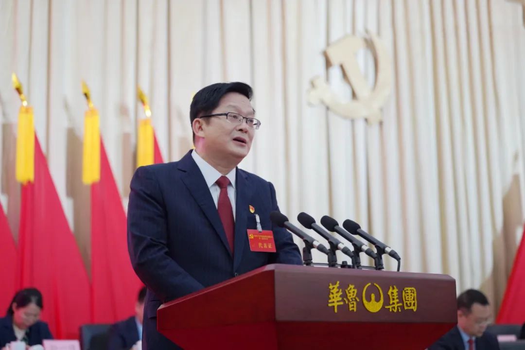 在熱烈的掌聲中,樊軍代表中國共產(chǎn)黨華魯控股集團有限公司委員會向大會作報告。