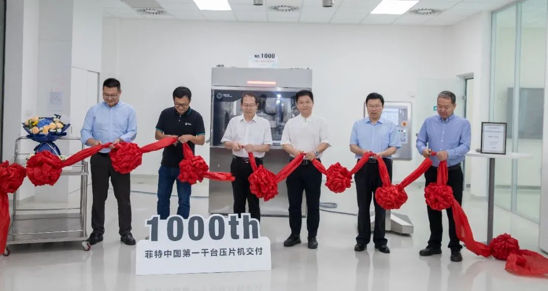 7月12日,菲特(中國(guó))制藥科技有限公司舉辦了“第1000臺(tái)壓片機(jī)交付儀式”,新華制藥副總經(jīng)理杜德清、206車間主任、黨支部書記王偉受邀出席并在現(xiàn)場(chǎng)共同見證了新壓片機(jī)的交付。菲特(中國(guó))工廠生產(chǎn)部負(fù)責(zé)人張愛、項(xiàng)目部負(fù)責(zé)人郝巖濤、銷售部負(fù)責(zé)人孫劍、客戶服務(wù)部負(fù)責(zé)人崔濤共同為第1000臺(tái)壓片機(jī)交付剪彩。菲特(中國(guó))公司總經(jīng)理安睿史博士在德國(guó)通過線上以視頻的形式致辭。