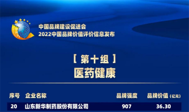 2022年9月5日,中國品牌建設(shè)促進(jìn)會(huì)、中國資產(chǎn)評(píng)估協(xié)會(huì)、新華社民族品牌工程辦公室等單位在京聯(lián)合發(fā)布“2022中國品牌價(jià)值評(píng)價(jià)信息”。新華制藥以36.3億元位列醫(yī)藥健康領(lǐng)域榜單第20位;品牌強(qiáng)度907,位列第7位。