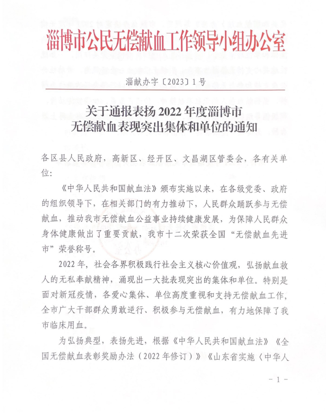 近日,淄博市公民無償獻血工作領導小組辦公室公布了2022年度淄博市無償獻血表現突出集體和單位名單。新華制藥及下屬子公司新達制藥,以及205車間和202車間集體上榜!