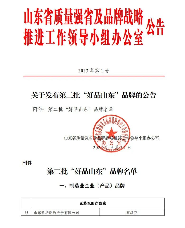 9月12日,由山東省市場監督管理局會同省委宣傳部、省發展改革委、淄博市政府共同主辦的山東省2023年“質量月”啟動儀式在淄博舉行。活動發布了第二批“好品山東”品牌名單,新華制藥布洛芬成功入選。