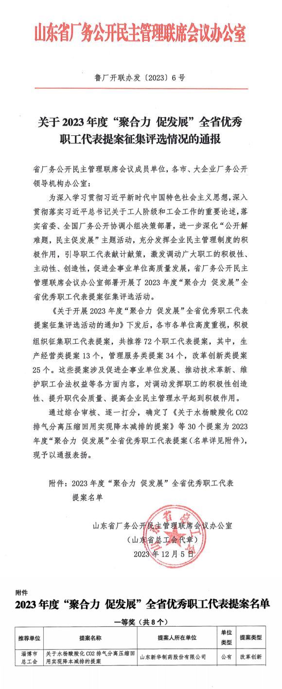 新華制藥提案榮獲2023年度“聚合力 促發展”全省優秀職工代表提案一等獎