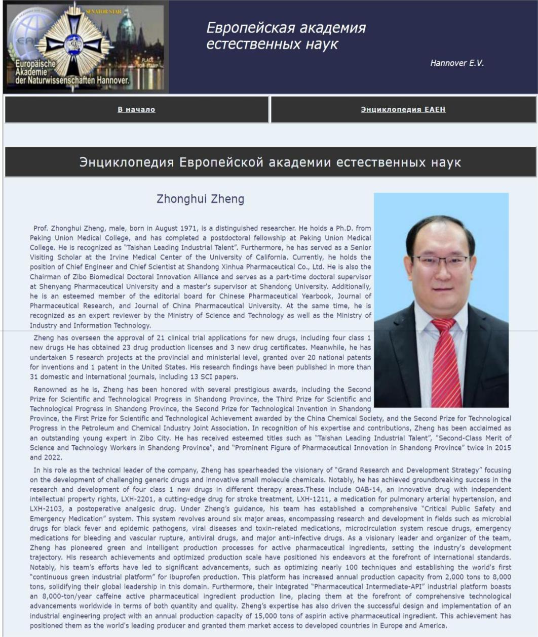 近期,歐洲自然科學院(Europaische Akademie der Naturwissenschaften)主席Tyminskiy Vladimir發來賀信,祝賀新華制藥副總經理鄭忠輝博士當選2023年歐洲自然科學院院士,以表彰其在醫藥領域取得的創造性成就。