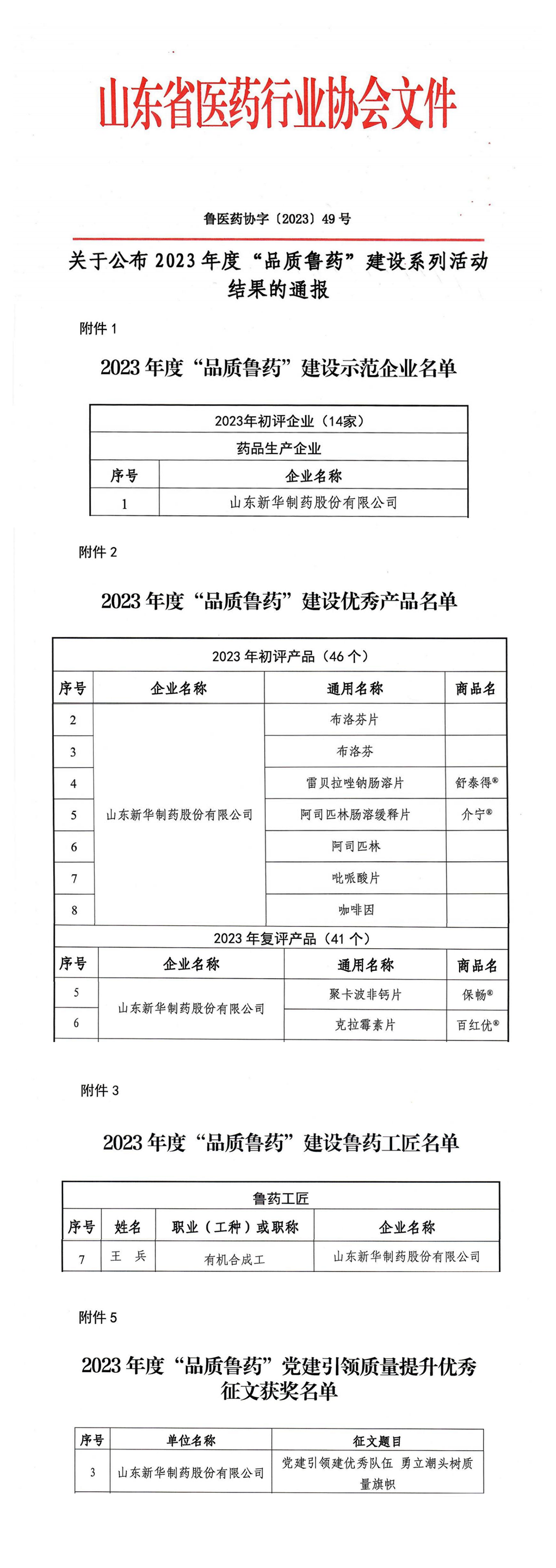 該名單經企業申報、專家評審、網絡投票、一票否決、結果公示等程序產生。新華制藥入選“2023年度“品質魯藥”建設示范企業”;布洛芬片、布洛芬、舒泰得、介寧、阿司匹林、吡哌酸片、咖啡因、保暢、百紅優等9個產品入選“優秀產品”名單;204車間王兵獲評“魯藥工匠”;制劑QA撰寫的《黨建引領建優秀隊伍 勇立潮頭樹質量旗幟》被評為黨建引領質量提升優秀征文。