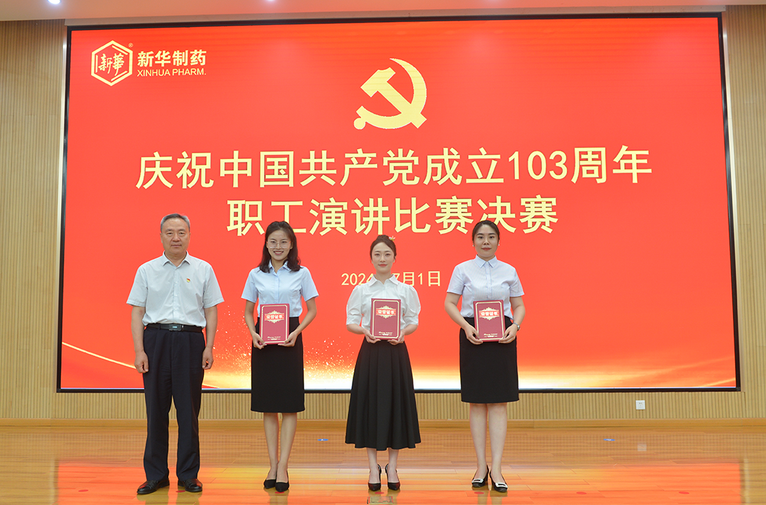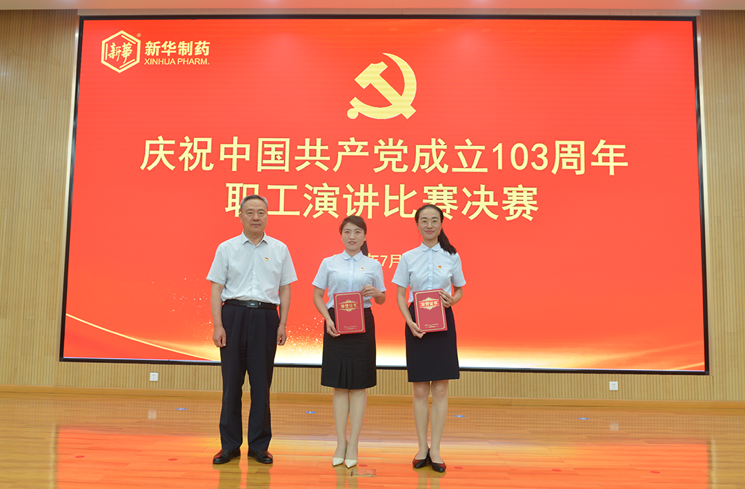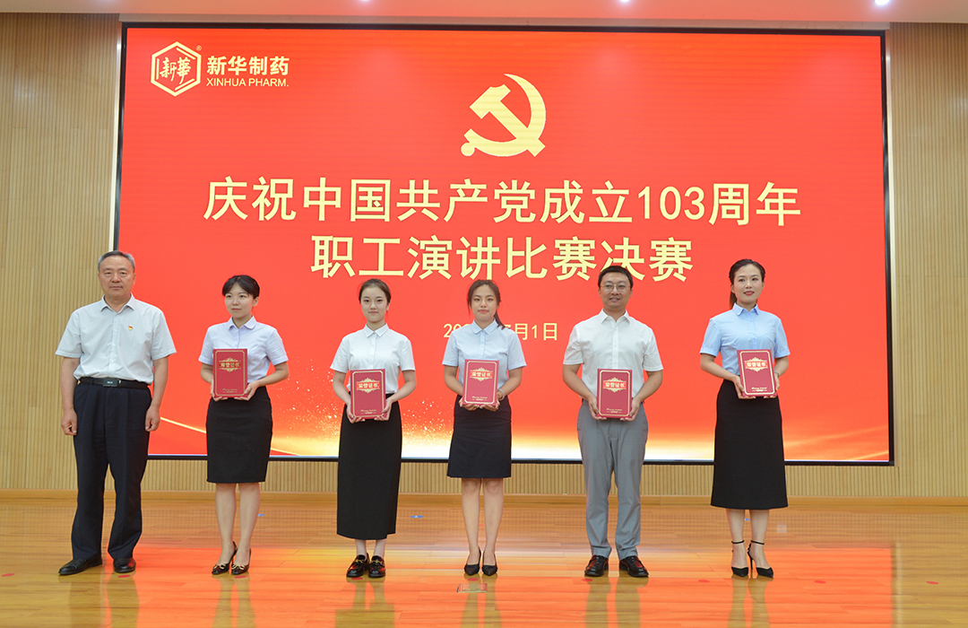 為慶祝中國(guó)共產(chǎn)黨成立103周年,進(jìn)一步弘揚(yáng)黨的優(yōu)良傳統(tǒng),傳承紅色基因,7月1日下午,新華制藥黨委舉辦了“慶七一”職工演講比賽決賽,公司黨委副書記、紀(jì)委書記、董事徐列與各黨支部書記、分會(huì)工會(huì)主席、團(tuán)支部書記、黨建聯(lián)絡(luò)員100余人共同觀看了比賽,徐列為獲獎(jiǎng)選手頒獎(jiǎng)。