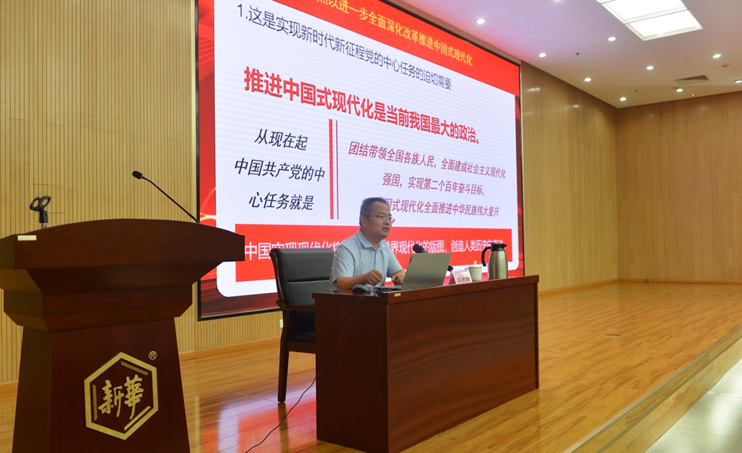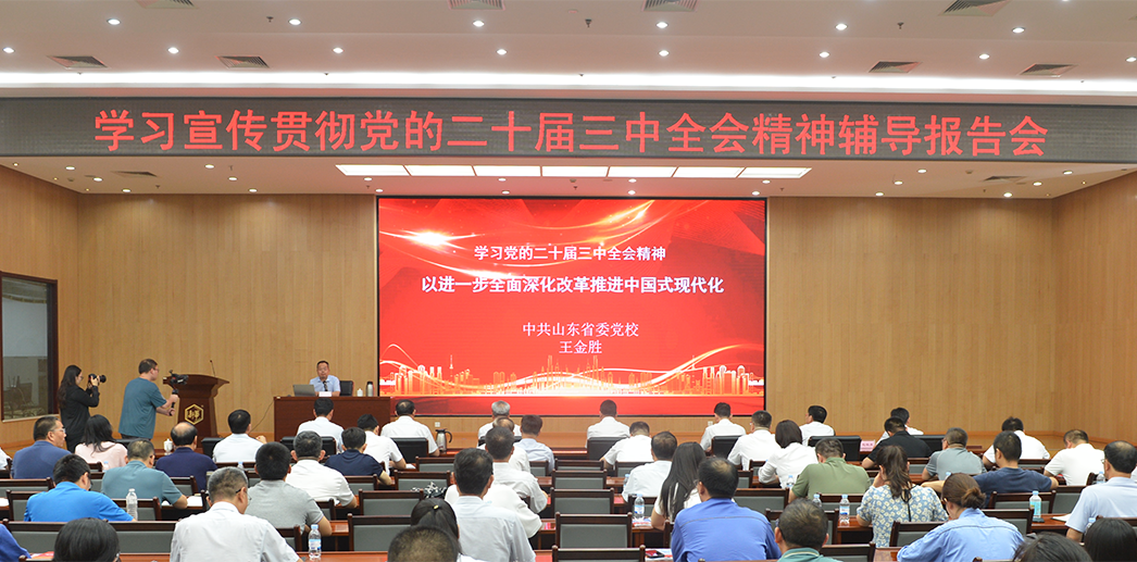 8月9日下午,新華制藥黨委組織黨的二十屆三中全會精神宣講報告會,邀請中共山東省委黨校(山東行政學院)王金勝教授做專題輔導,公司領導班子、各黨支部書記、黨建聯絡員、團支部書記等120余人參加。