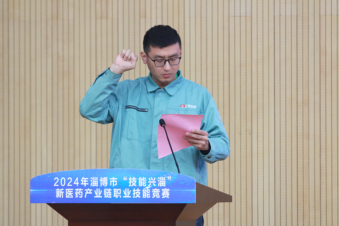 淄博職業學院制藥工程系主任鞏健、齊都藥業馮志剛分別代表裁判、選手進行了莊嚴宣誓。