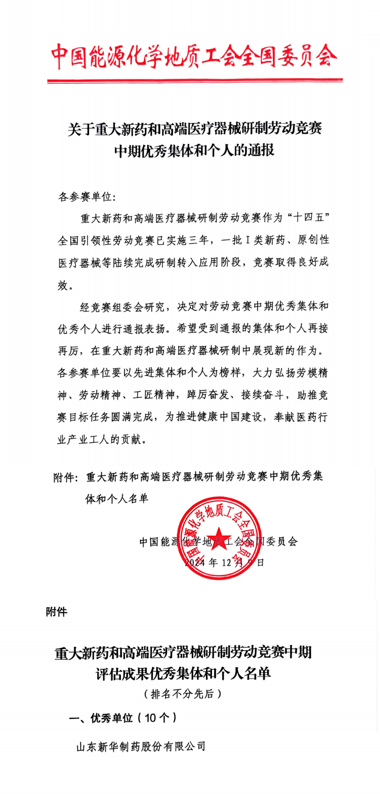 12月12日,由中國能源化學地質工會主辦、中國醫藥工業信息中心承辦的重大新藥和高端醫療器械研制勞動競賽技術交流活動在上海舉行,新華制藥獲評“重大新藥和高端醫療器械研制勞動競賽中期評估成果優秀單位”。