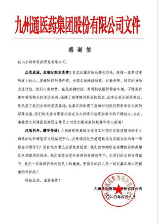 就在此時,新華制藥的合作單位九州通醫藥集團股份有限公司送來了誠摯的感謝信,信中提到:“自武漢爆發新冠肺炎以來,疫情一直牽動著所有人的心。疫情防控形勢嚴峻,全國各地陸續封路,運輸受限,預定的貨物無法送達,我們心急如焚。在此關鍵時刻,貴司積極組織運輸車輛,不惜高價請車將貨物及時送達我司,保障了疫情期間藥品的供應。”