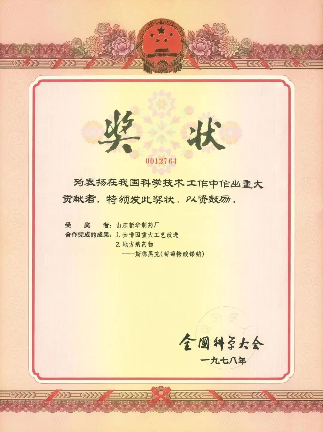 據了解,在新中國成立之初,北方地區多個省份曾出現大規模黑熱病(俗稱大肚子病),僅山東就有70萬患者。這是新中國成立后山東第一場大規模防疫阻擊戰,國家指令當時的新華制藥盡快研制出特效藥。接到命令,新華制藥立即組織起一支精干的研發團隊,他們克服原料短缺、設備落后等惡劣條件,于1950年7月成功研制出了特效藥斯銻黑克(葡萄糖酸銻鈉注射液),一舉撲滅了肆虐山東以及北方多個地區的黑熱病,解放了200多萬勞動力。斯銻黑克和新華制藥重點產品咖 啡因,曾同時榮獲1978年全國科技大會獎狀。多年來,雖然斯銻黑克用量極少,但新華制藥一直不計成本保持適量儲備,以備患者不時之需。