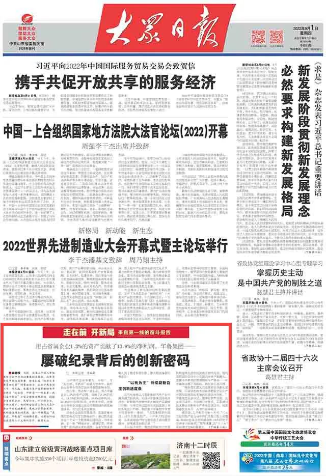 大眾日?qǐng)?bào)9月1日刊發(fā)題為《來(lái)自第一線的奮斗報(bào)告丨華魯集團(tuán)屢破紀(jì)錄背后的創(chuàng)新密碼》的報(bào)道。