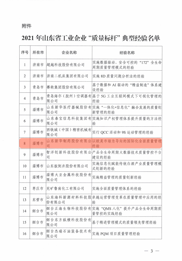近日,山東省工業(yè)和信息化廳公布了2021年山東省工業(yè)企業(yè)“質(zhì)量標(biāo)桿“典型經(jīng)驗名單,新華制藥榜上有名,“以歐美市場為導(dǎo)向的國...